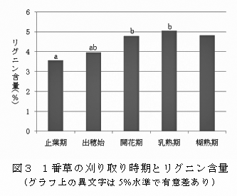 1番草のリグニン(ADL)含量は刈り取り時期が遅れるにしたがって増加する(図3)。 |