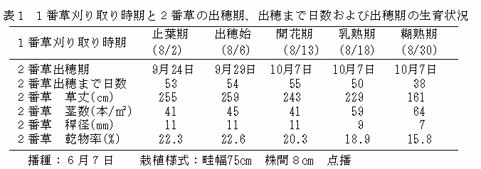 2番草の出穂期は1番草を開花期以降に刈り取った場合、10月上旬となる。1番草刈り取りから2番草出穂までの日数は、1番草を止葉期~開花期に刈り取った場合、53~55日であるが、乳熟期刈り取りでは50日、糊熟期刈り取りでは38日に短縮する(表1)。 |