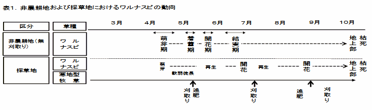 刈り払いしない放置圃場でのワルナスビの生育特性は、萌芽は4月下旬から5月中旬、開花は6月中旬、結実は7月初中旬である。また、刈り払いすれば数回萌芽を形成し開花までに至る。また、一般草地での一番草刈り取り時のワルナスビは軟弱徒長傾向となる(表1)。 |