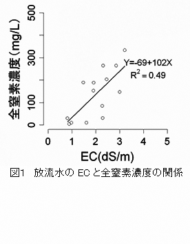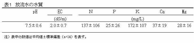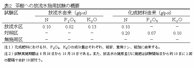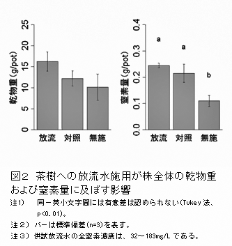 電気伝導度による全窒素濃度の推定が可能な放流水を茶の栽培に利用する一手法として、窒素施用量の50%を硫安から放流水に含まれる窒素によって代替することにより、茶樹の乾物重や窒素量を指標とするその生育は、化成肥料のみの場合と同等である。 | ||||||