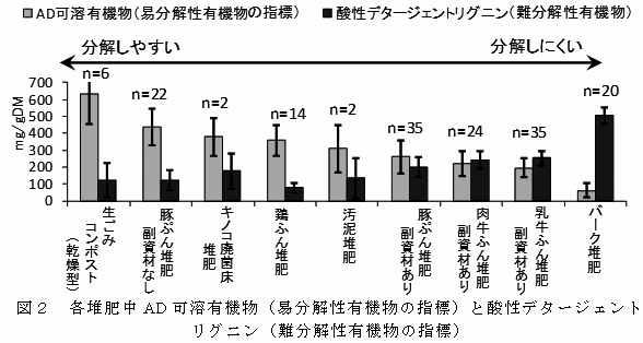 バーク堆肥や牛ふん堆肥等は難分解性有機物が多く易分解性有機物が少ない。これらの堆肥は、土壌改良資材として優れ、また炭素貯留機能が期待される(図2)。 |