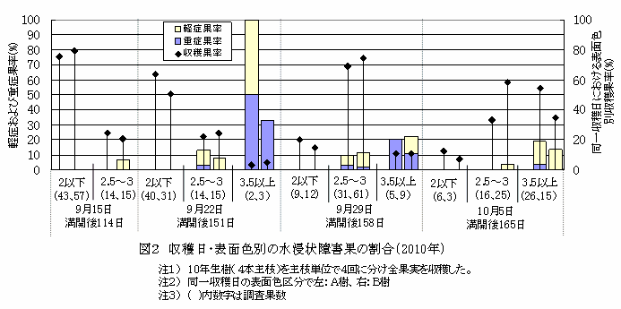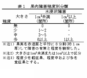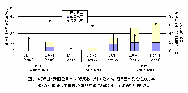 同一収穫日での水浸状果肉障害の発生は、表面色が進むに従い、重症果の発生割合が高くなる。「あきづき」用表面色2以下(「豊水」用表面色の4に相当)の未熟果には、水浸状果肉障害の発生がみられない。 | ||||||||