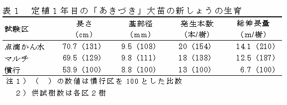 「あきづき」大苗(2年生)を3月に定植し、4月後半から11月にかけて、点滴かん水した区とポリエチレンフィルムで被覆した区を設けた。定植1年目の新しょうの長さ及び基部径、発生本数の生育は慣行に比べて増加する(表1)。 |
