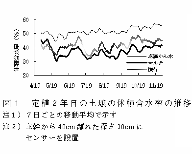 マルチをすると、地温は慣行に比べて高くなるが(図2)、土壌の体積含水率は慣行に比べて低くなる(図1)。根が最も伸長する5月における地温が根の生育に好適な20℃前後に維持され、樹の生育が向上すると考えられる。また、体積含水率の平均は植物が容易に水を吸収するのに適正な範囲内であり、下限値も30%前後であることから、樹の生育に負の影響を及ぼしたとは考えられない。 |