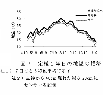 点滴かん水をすると、土壌の体積含水率は慣行に比べて高く推移するが(図1)、地温は慣行と同程度である(図2)。定植1~2年目の生育を考えると、土壌水分は高い方が良く、この時期の点滴かん水は効果が高いと考えられる。 |