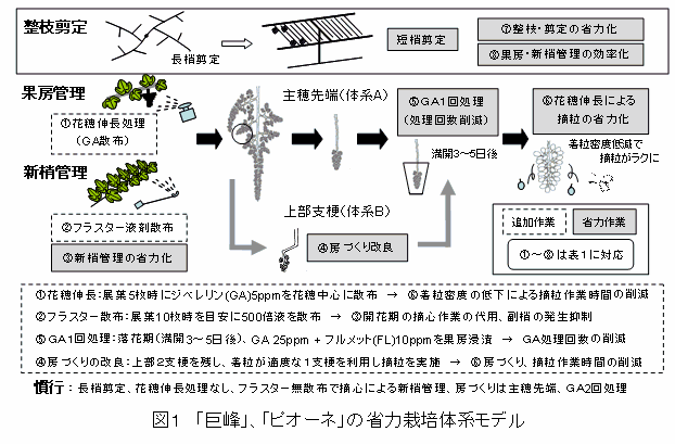 「巨峰」、「ピオーネ」の栽培で、ジベレリン(GA)による花穂伸長を利用した摘粒作業の省力化、フラスターの新梢伸長抑制効果を利用した新梢管理の省力化、房づくり方法の改良、GA1回処理、短梢剪定の導入による省力体系は図1のとおりである。 |