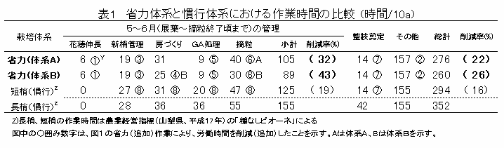 省力体系の作業時間を試算すると、慣行の長梢剪定栽培と比較して、年間の作業時間を22%(352→276時間)削減できる。とくに労力が集中する5~6月の果房、新梢管理時間は、32%(155→105時間)削減できる(体系A)。また、花穂上部の支梗を利用する方法(体系B)では、さらに省力効果が高まり、5~6月の作業時間を40%以上削減できる(表1)。 |