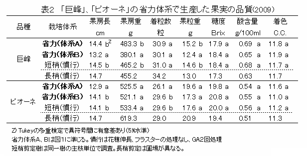 省力栽培体系による栽培でも慣行とほぼ同等の果実品質が維持できる。しかし、花穂上部の支梗を使用した場合、「巨峰」では果粒肥大が劣ることがある(表2)。 |