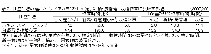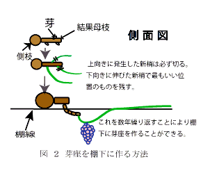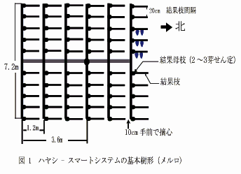 ‘ハヤシ-スマートシステム’は、主枝を南北に伸ばし側枝を東西方向に1.2m間隔で配枝して更に新梢を北に誘引する片側短梢せん定法で、醸造用ブドウにおいて高糖度果実を省力的に生産でき収量も確保できる。 | ||||||||||