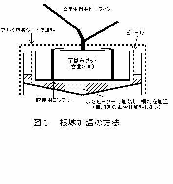 根域無加温では室温を15℃、18℃のいずれにした場合も、加温開始から発根まで11~12日、発芽まで21日を要するが、根域加温すると室温15℃でも加温開始後7日で発根し、20日で発芽する(表1)。 |