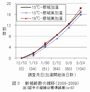 新梢の節数は、根域加温すると室温を15℃にしても、加温開始後約80日まで室温18℃根域無加温と同等になる。それ以降は、室温15℃で根域加温をしても、根域加温しない場合と節数増加の速さは同等で、室温18℃加温の方が生育が早くなる(図3)。 |