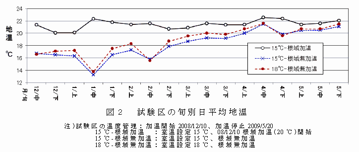 12月上旬の加温開始と同時に、図1の方法で水を加温して地温を20~22℃に維持する。加温開始後90日の3月中旬以降、根域無加温の地温が高くなり、根域加温との地温差は小さくなる(図2)。地温と同様に室温も3月中旬以降は15℃設定と18℃設定の温度差が小さくなり、2℃程度の差になる(データ略)。 |