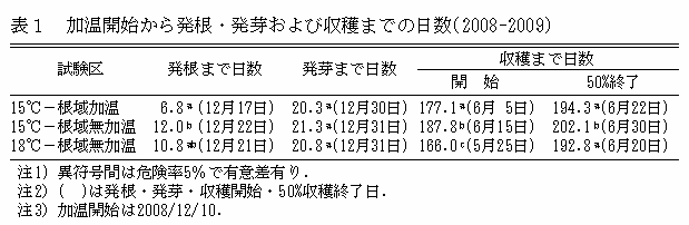 根域加温して加温終了まで室温15℃設定とすると、収穫開始期は室温18℃根域無加温より10日、50%収穫終了日は2日遅れる。しかし、室温15℃根域無加温より収穫開始日は10日、50%収穫終了日は8日早くなる(表1)。 |