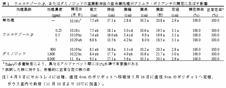 [キーワード]プリムラ・ポリアンサ、促成栽培、低温処理、鉢物、変温、わい化剤 |
