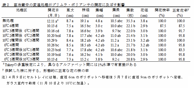 プリムラ・ポリアンサの苗を、8月に低温処理すると、開花は早まるが草姿が乱れる。0℃1週間処理後に10℃3週間処理の変温管理を行うと、葉幅が広くなり草姿が改善されるとともに、10℃4週間の低温処理と同様に開花が促進する。 | ||||