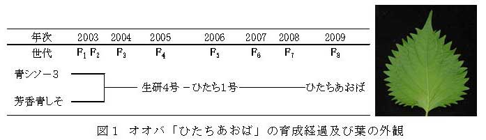 「ひたちあおば」は、2003年に「青シソ-3」(長野県産)と「芳香青しそ」(福岡県産)を交配し、選抜、固定を進めた品種である(図1)。 |