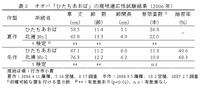 「ひたちあおば」は、現地で栽培されている選抜系統「北浦No.1」と比較すると、草丈はやや低く、節数はやや少ないが、有効茎数(収穫可能な葉を付ける茎の数)はやや多い(表2)。 |