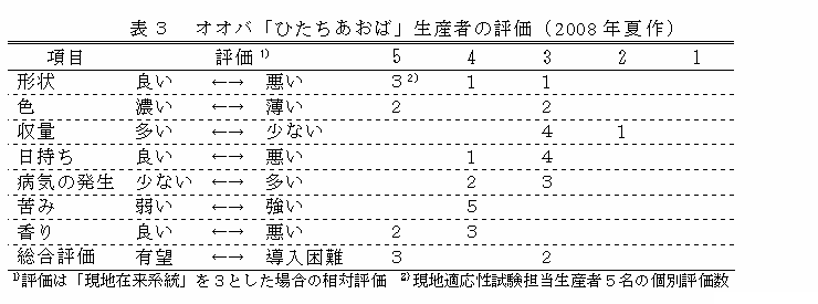 「ひたちあおば」を現地で試験栽培している生産者へのアンケート調査では、それぞれの生産者が栽培している「現地在来系統」と比較すると、形状、香りが良く、苦みは弱く、品質の評価が高い。収量は「現地在来系統」に比べてやや少ないが、問題にはならない程度であり、総合評価では有望という評価である(表3)。 |