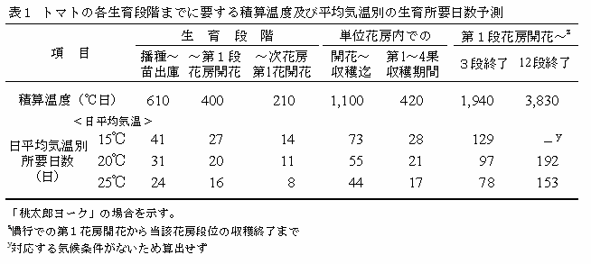 日平均気温は立地や施設の種類(ガラス温室かプラスチックフィルムか等)の影響を、また、各生育段階までに要する生育日数は品種の早晩性の影響をうけるので、予測した生育所要日数と実際の所要日数との間には7~10日(積算温度で150~200℃日)程度の誤差が生ずる。 |