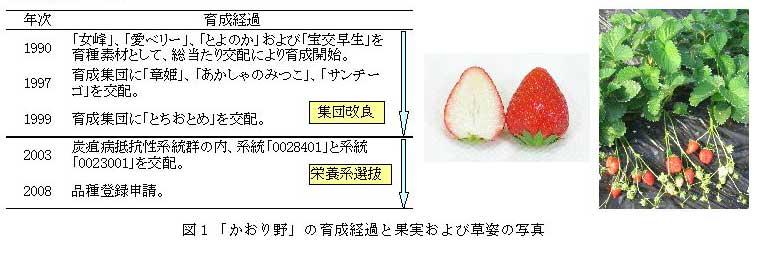 「かおり野」は、「女峰」、「愛ベリー」、「とよのか」、「宝交早生」、「章姫」、「あかしゃのみつこ」、「とちおとめ」および「サンチーゴ」の8品種を基に炭疽病抵抗性選抜と系統間交配を繰り返して育成した系統同士(系統0028401×系統0023001)を2003 年に交配して得られた実生集団から選抜された促成栽培用品種である(図1)。 |