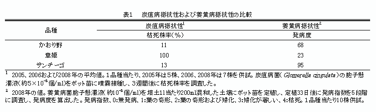 炭疽病抵抗性品種「サンチーゴ」と同等の強度の炭疽病抵抗性を持つ。萎黄病抵抗性は「章姫」より弱い(表1)。 |