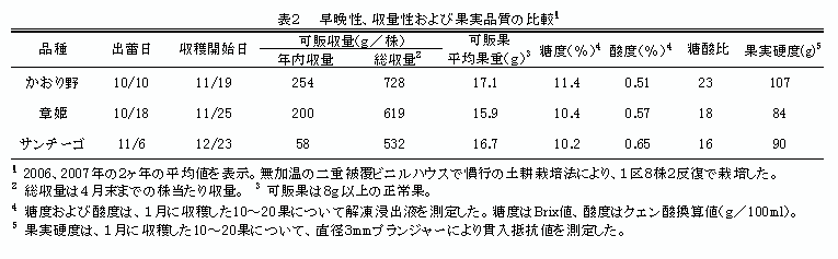 頂花房の花芽分化時期は9月10日前後で、収穫開始時期は早生性の強い品種である「章姫」よりも早い。年内収量および総収量は「章姫」および「サンチーゴ」より多い(表2)。 |