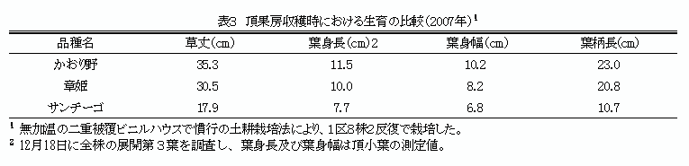 草姿は立性で、生育が極めて旺盛であり、葉の大きさおよび葉柄の長さは「章姫」、「サンチーゴ」より大きい(表3)。葉色は黄緑色で「章姫」、「サンチーゴ」より淡い。連続出蕾性および低温伸長性は優れている。 |