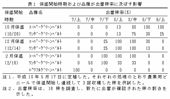 [キーワード]抽苔軽減、ニラ、周年栽培、保温開始時期、品種 |