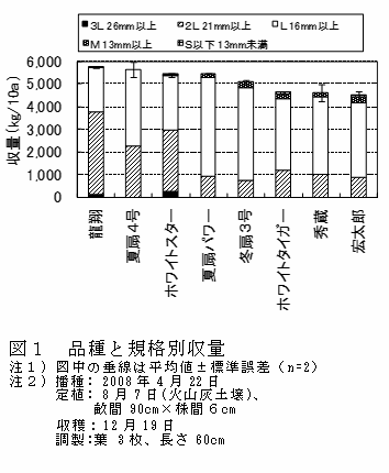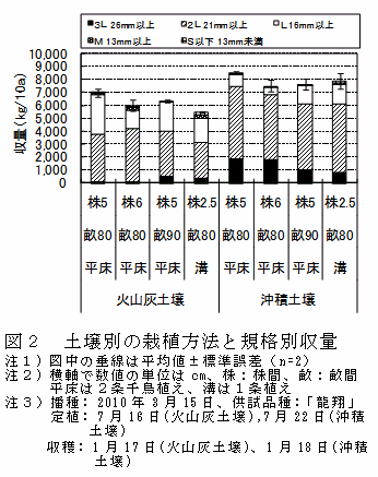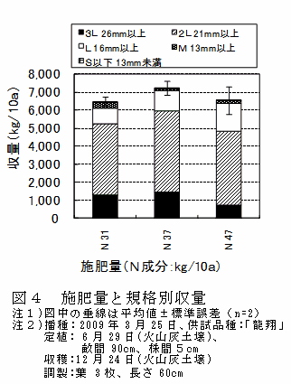 火山灰土壌での施肥量は、窒素成分で37kg/10aと、慣行(25kg/10a程度)よりも多く施肥することで、総収量は7,200kg/10a、2L規格以上の大型規格収量は6,000kg/10aと多収になる(図4)。 |