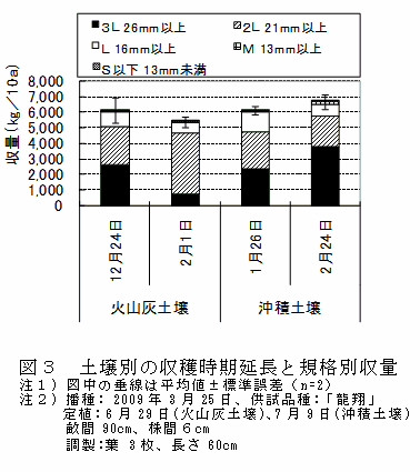 収穫時期は、火山灰土壌では冬期の寒さや乾燥で株の生長が止まり、外葉の枯死により収量が減少する場合もあることから年内までとする。一方、沖積土壌では冬期でも少しずつ生長するので、収穫時期を2~3月まで延長することで収量を増やすことが可能である(図3)。 |