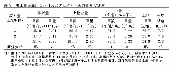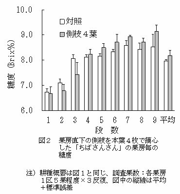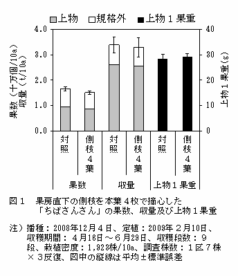 「ちばさんさん」の半促成栽培では、果房直下の側枝を本葉4枚で摘心して葉数を増やすことにより、果数、収量及び1果重を減らすことなく糖度が向上する。また、4L/週/株程度の灌水を行うことにより、小果を減らすことができる。 | ||||||||||