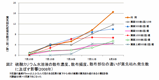 夏秋トマトにおいて、硫酸カリウム水溶液500~2000倍を週2回葉面散布することで葉先枯れ症を抑制することが可能である。散布部位は植物体上端から50cm程度で良い。 | ||||||||