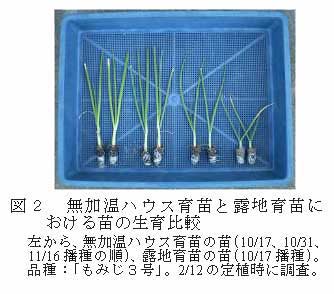 無加温ハウス内で育苗することにより、露地で育苗するよりも短期間で、生葉数が多く、葉長が長く、かつ、葉鞘径も太い苗を育成できる(図2)。 |