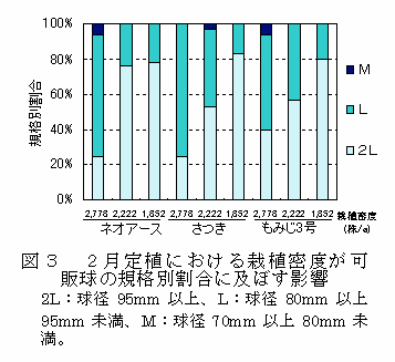 2L球割合は、2,778株/a(うね幅120cm、株間12cm、4条植え)では3品種とも25~40%であるが、2,222株/a(うね幅120cm、株間15cm、4条植え)では「ネオアース」が76%、「さつき」が53%、「もみじ3号」が57%と高くなる(図3)。1,852株/a(うね幅120cm、株間18cm、4条植え)では、3品種ともさらに80%程度に高まるが(図3)、単位面積当たりの可販球収量は低下するため(データ略)、2Lの大玉が求められる業務用需要では、2,222株/aの栽植密度が適する。 |