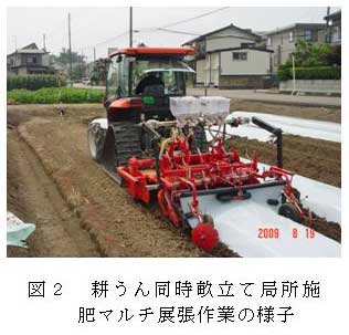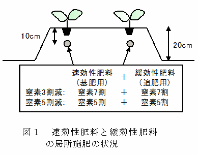 施肥は耕うん同時畝立て局所施肥マルチ作業機で、速効性肥料と緩効性肥料(被覆尿素)を3:1(窒素成分重量比)程度に混合して、畝上面から深さ約10cmに筋状に入れる(図1、図2)。施肥量は、窒素成分のみ慣行の3割減または5割減に調整する。 |
