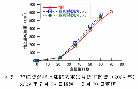 ブロッコリーの地上部乾物重は定植22日後以降急激に増大するが、無マルチ慣行施肥(慣行区)に比べて、マルチ局所施肥(窒素3割減マルチ区および窒素5割減マルチ区)ではやや大きく推移する(図3)。 |