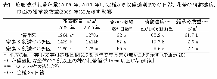 マルチ局所施肥でも無マルチ慣行施肥と同等かそれよりも大きい花蕾収量が得られる(表1)。収穫適期は窒素3割減で最も早く、次に窒素5割減、無マルチ全層施肥の順になる(表1)。 |