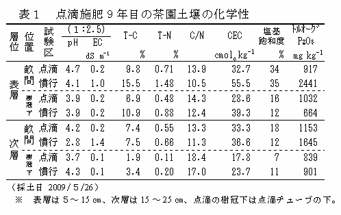 試験開始後9年目の茶園土壌の化学性を見ると、点滴施肥では、慣行施肥に比べ、土壌pHは高く、ECは極めて低くなり、無機態窒素、T-C、T-N、CEC、トルオーグリン酸が減少している。これは、有機物を施用せず、毎日少しずつ必要な量の肥料のみを施用する当点滴施肥の特徴であり、チャ生育上の問題点はない(表1)。 |