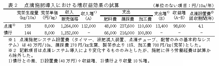 点滴施肥システムを導入した茶園での収益は、点滴施肥の効果が比較的小さい場合(荒茶生産量で10%増加すると仮定)でも、年間10a当たり98,600円の収益増となる。システム設置費を40万円/10aとすると、設置費回収期間は4.1年となり、更に施肥に関する労力削減効果を考慮すると、導入のメリットは大きい(表2)。 |