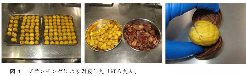 ぽろたんの鬼皮,渋皮を大量に剥皮するのに最も適した方法はブランチングによるものであり,一人で10kg(約350粒)を約80~90分で剥皮することが出来る。 | ||||
