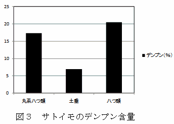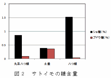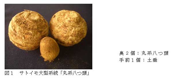 埼玉県が選抜したサトイモ大型系統「丸系八つ頭」は、子いも用種「土垂れ」(県の主品種)と比較し、ショ糖含量およびデンプン含量が高い。イモの形態が大型の丸系であるため、調理時の皮むき作業性が良く、廃棄率も低い。 | ||||||||
