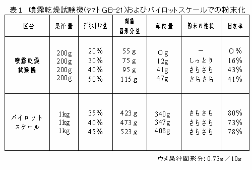 紅サシ濃縮ウメ果汁(5倍濃縮)を用い、噴霧乾燥試験機(ヤマトGB-21)でさらっとした粉末にするには、重量比で果汁の40%以上のデキストリンが必要である(表1)。 |