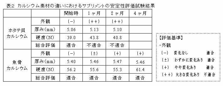 ホタテ貝カルシウムで試作したサプリメントは、安定性加速試験1カ月経過後にウメ果汁の有機酸と炭酸カルシウムとの中和反応による黒い斑点が生じ、粒がもろくなるが(図2、表2)、リン酸カルシウムが主体である魚骨カルシウムで試作したサプリメントは、粒の外観変化が少なく硬度変化が10%以内で、品質が安定で製品規格に適合する(図2、表2)。 |