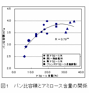 米粉パンの膨らみの程度(比容積)は米粉のアミロース含量に大きく影響され、アミロース含量が15%以上で望ましいパン比容積値(概ね3.5以上)となる(表1、図1)。 |