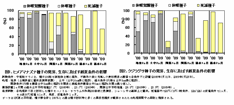 小麦収穫後に畑条件で不耕起(地表面)または耕起(土中)管理とすると、越夏したヒメアマナズナ、クジラグサ、グンバイナズナ種子は、おおむね90%以上が生存種子(休眠覚醒種子+休眠種子)で、死滅した種子は1割程度にとどまる(図1~3)。 |
