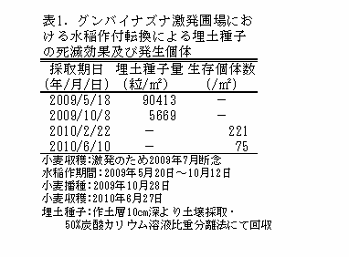 麦作で問題となる帰化雑草ヒメアマナズナ、クジラグサ、グンバイナズナの種子死滅のため、夏期に2ヶ月間の常時湛水とする圃場管理を行うと生存種子を1%未満に激減できる。 |