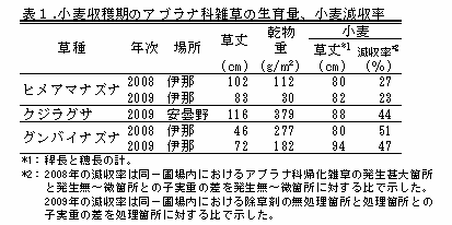 ヒメアマナズナの草丈は小麦より20cm程高く機械収穫の支障となり、小麦の減収は28%程度となる(表1)。クジラグサの草丈は小麦より30cm程高く機械収穫の支障となり、甚大に発生すると38%程度の減収となる(表1)。グンバイナズナの草丈は小麦より30cm程低く目立たないものの、小麦の減収は50%程度に及ぶ(表1)。 |