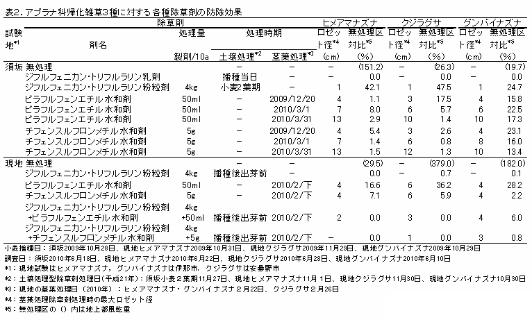 3草種ともに播種後出芽前のジフルフェニカン・トリフルラリン乳剤処理の効果がきわめて高い(表2)。 |