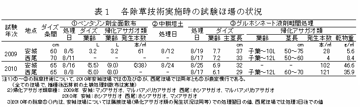 帰化アサガオ類多発生ほ場での適用が効果的である。 |