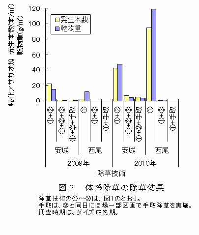 ダイズ成熟期の帰化アサガオ類残草量は、畦間除草の追加により、前処理のみに比べ発生本数で0~16%、乾物重で0~9%となり、前処理と手取除草の組み合わせと同等にまで激減する(図2)。 |